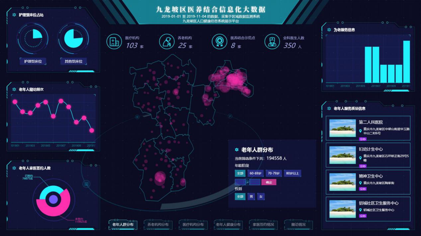 养老产业的智慧化升级已经成为我国应对人口老龄化过快增长的必然趋势。建设“九龙坡区卫健委医养结合信息化系统”,是贯彻《重庆市以大数据智能化为引领的创新驱动发展战略行动计划(2018—2020年)》文件精神,落实智慧养老建设要求的具体举措。通过构建医养结合管理子系统,全面分析以及监督九龙坡全区医养结合建设情况,为老年人提供“医养结合、以养为主”为核心的健康养老专业服务,包括持续的日常保健、健康促进、中医康复、养老护理、其他生活便利服务,以及个性化的专业定制服务,利用大数据智能化技术赋能,提高服务精准度,为重庆养老产业赋能、为重庆老人生活添彩。同时,有效挖掘医养数据内在价值,实现管理者对于医养结合运行状态和潜在问题的“先知、先觉和先行”,打造全国大数据、云应用示范标杆。