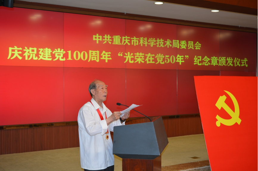 党龄63年的喻人龙同志作为老党员代表现场发言,他怀着激动的心情向大家分享了自己在党的领导下为科技事业发展奋斗的历程和感悟。仪式结束后在接受市电视台采访时表示:要活到老,学到老,为党为人民多作贡献,在新时代的长征路上,坚守初心如磐,老当益壮,再书使命!